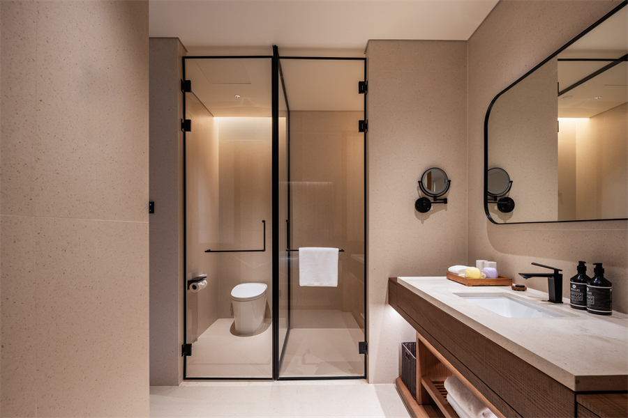 值得一提的是,卫生间体验尤为出色:采用干湿分离设计,整体干净整洁度极高,配套设施完善,不仅有高品质洗漱台、马桶与淋浴喷头,还提供品牌洗护用品、一次性洗漱用具及充足收纳空间,满足需求又显整洁。