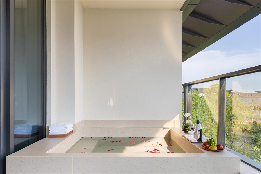 酒店内还有一处1200m²的青翠庭院,如一幅铺展的画卷,既是绝佳的景观打卡地,也是多功能户外场域,晨起可以打打太极,舒展身心。
