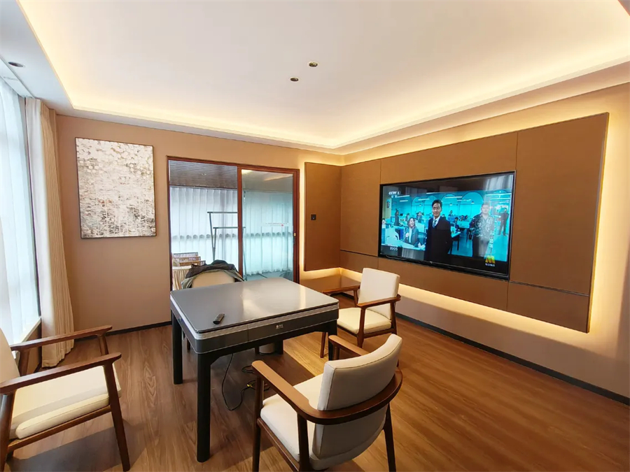 复式棋牌树屋的130㎡双层空间隐匿于竹林秘境,复式格局分层拓展休闲与休憩功能:一层休闲区设自动麻将机与原木茶桌,搭配全景落地窗,推窗可赏白鹭掠林、香樟映翠,适合亲友围坐互动;二层睡眠区科学排布 1 张 1.8 米大床 + 4 张 1.2 米单人床,均配温润亲肤寝具,同时预留独立储物区,轻松容纳 6-8 人入住。