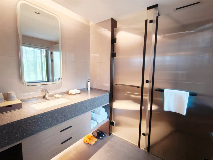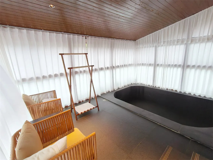 房间延续 2025 年升级配置,全屋地暖保障四季恒温,一层独立区域设景观温泉泡池,接入 76℃偏硅酸珍稀温泉,1 小时即可注满,夜泡时可伴虫鸣观星空;卫浴区做防滑处理,配备多套洗漱用品,贴心适配多人使用需求。
