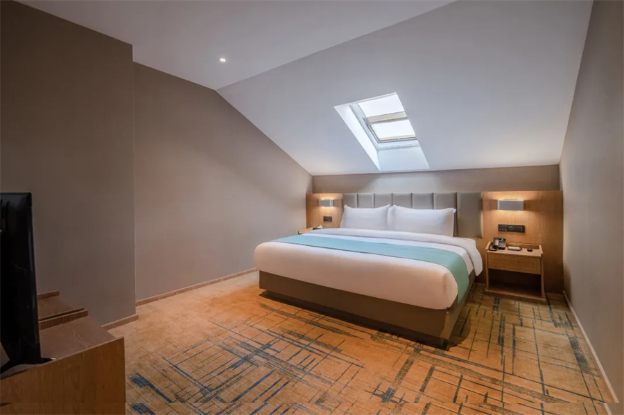 客房藏匿于园林之中,内部以米黄色、木原色搭配组合,全屋地毯,古典优雅大气。