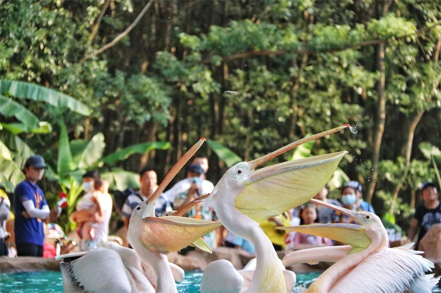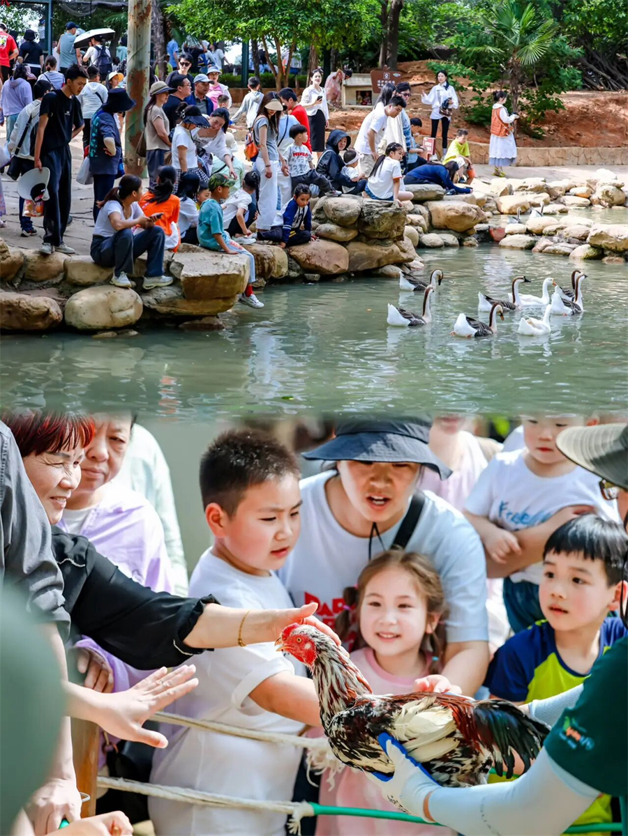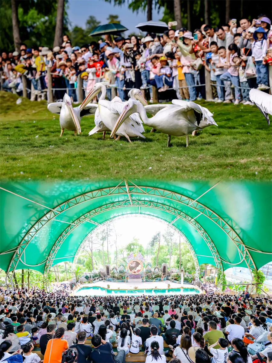 动物百老汇:除经典的鹦鹉嗑瓜子比赛、鸬鹚潜水外,新增小浣熊灵活登场、东非鹳优雅踱步环节,每场设互动彩蛋,游客可登台近距离接触动物,轻松 get 物种小知识。