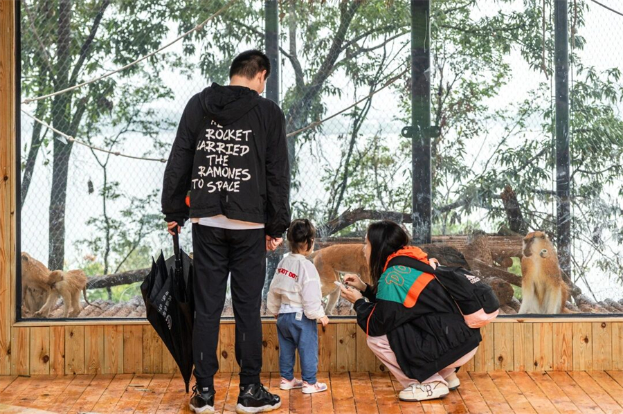 猿猴户外乐园为灰斑悬猴、猕猴、赤猴等灵长类动物打造了三座错落有致的户外林下馆舍,每栋 “野外豪宅” 都配备了纵横交错的爬绳、秋千与小水池,其中一栋还藏着小巧的树屋,看着猴子们在里面嬉戏玩耍,格外解压。