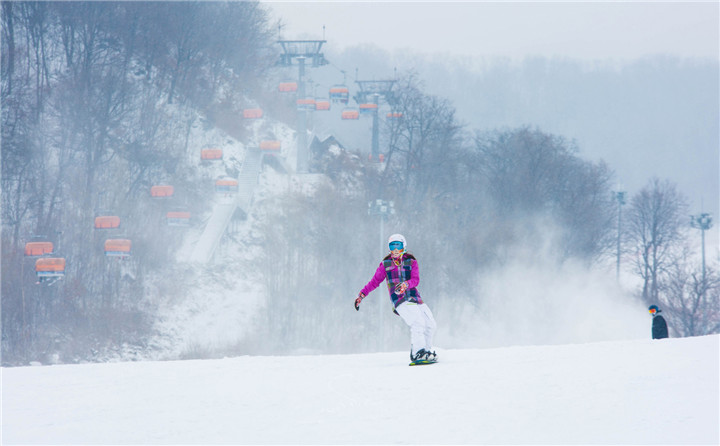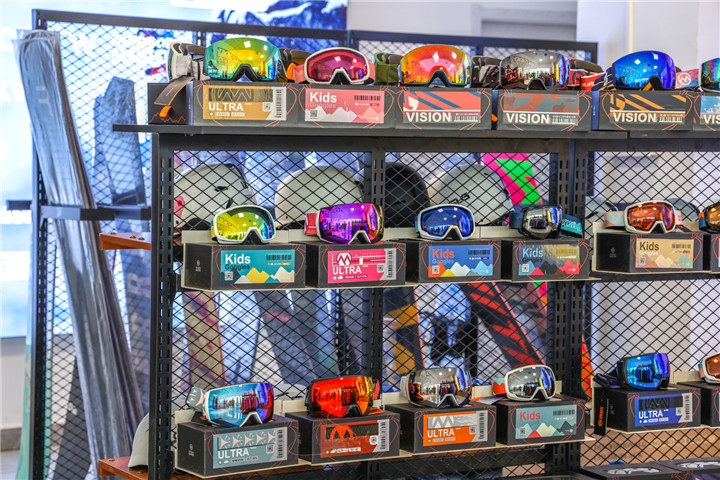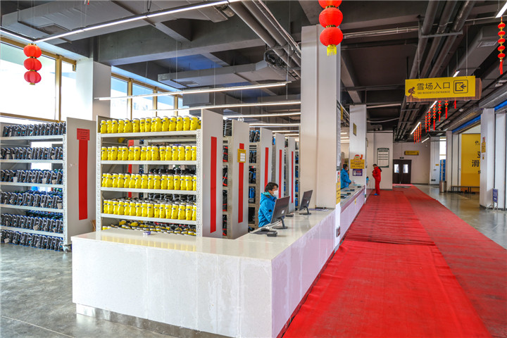 走进滑雪场的雪具大厅(占地2000平方米),滑雪双板、单板和雪鞋排列有序。在雪具大厅的二楼,还配有雪具商店,以及自助餐吧和冷热饮柜台,随时补充能量。