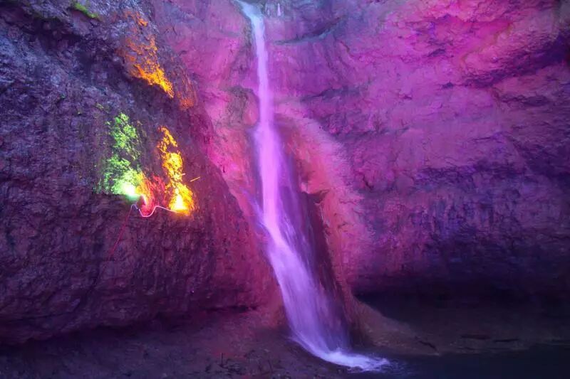 “地心大瀑布”是巴王水寨的核心景点。一个以大量地下瀑布,罕见的地下峡谷,绝美的溶洞奇观形成的景点。景点内,钟乳密布,石幔林立,形态各异,地心瀑布全长2000多米。89米的软梯让游客有惊无险地从地心第一道瀑布直下,进入神秘的地心。动感的灯光形成彩虹桥,软梯和防护拦形成了绝壁栈道,向游客展现出一个世上少有的地心世界。