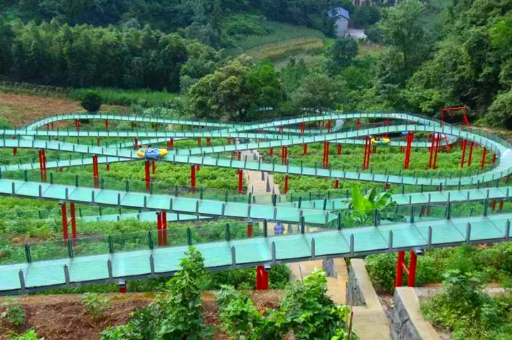 “高空玻璃水滑道”从双叠瀑布形成的落水洞取水,滑道全长2080米,垂直高度118米,最高单点落差8.5米,设有“S”型、“C”型弯道和缓冲,6个循环2个转盘。“游客可以坐着橡皮筏里,沿着蜿蜒曲折的玻璃水滑道,穿过田野、越过树梢,既可以欣赏山间美景,又可以感受清凉与刺激。