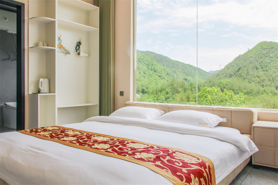 客房宽敞明亮,空间很足,环境干净整洁。还设有大落地窗,可以自在看山景,为客人带来高质量的度假体验。