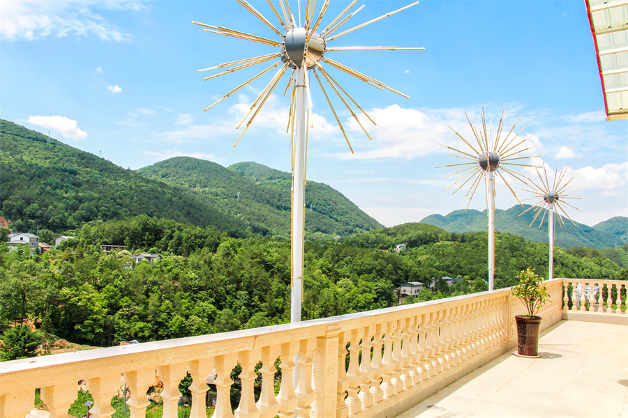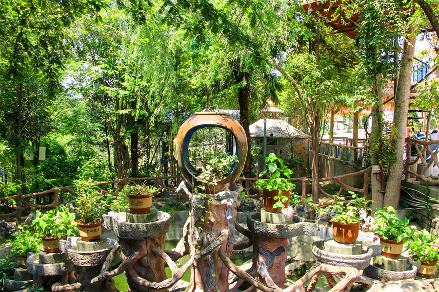 民宿设有清幽的庭院,到院子里走走逛逛,各色花木葱葱郁郁,土家石磨的景观独具特色,林下的梅花鹿雕塑让人仿若置身秘境森林。