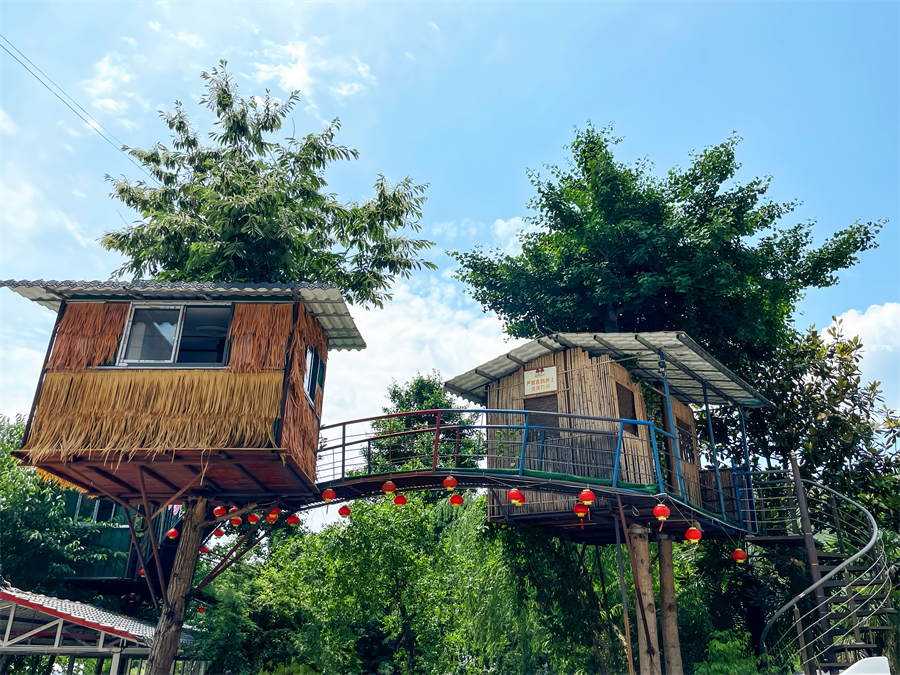 还打造了特色树屋,设置了打卡拍照场景。坐在树屋里吃饭聊天,在庭院里拍照,乐趣十足。