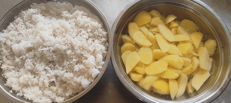 选高山土豆(粉糯香甜),切块煎至金黄,与半熟米饭同焖,加腊肉末更香。米饭油润吸薯香,土豆外焦里化,一口有饭、薯、肉三重香,家常又暖心。