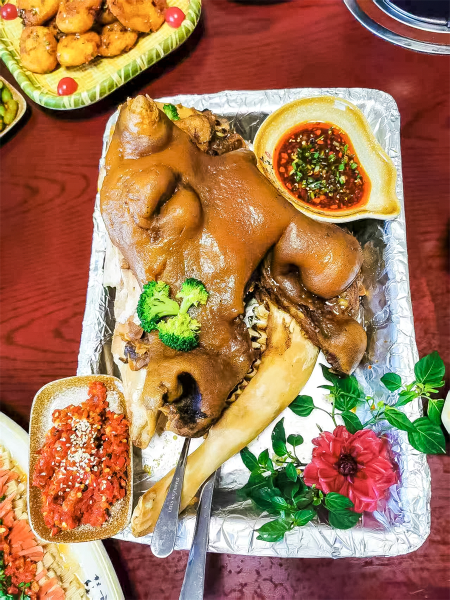 铁板猪头:鲜 / 腊猪头经基础处理后,用秘制卤水卤制,香气扑鼻、口感丰富,适配卤味爱好者。