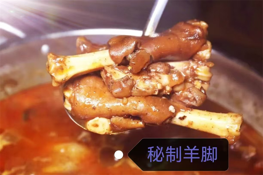 秘制羊脚:鲜羊脚经秘制卤水卤制加工,肉质鲜嫩丝滑、卤香十足。