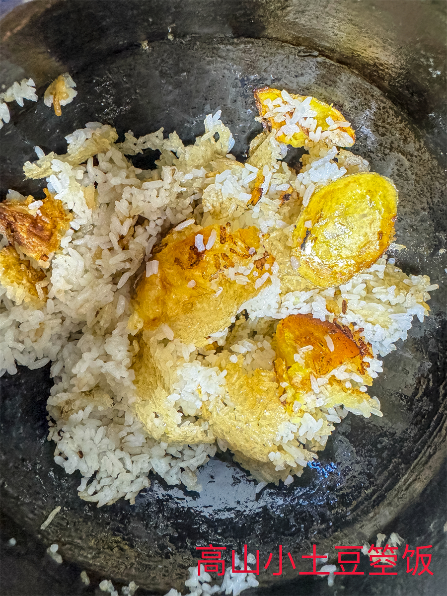 主食惊喜当属高山小土豆箜饭,食材选用野三关高海拔山地种植的小土豆,烹饪时将去皮小土豆与本地大米一同放入柴火灶铁锅,每一粒米都裹着土豆的清香,土豆在灶火中慢慢变的外焦内粉,好吃的停不下来。