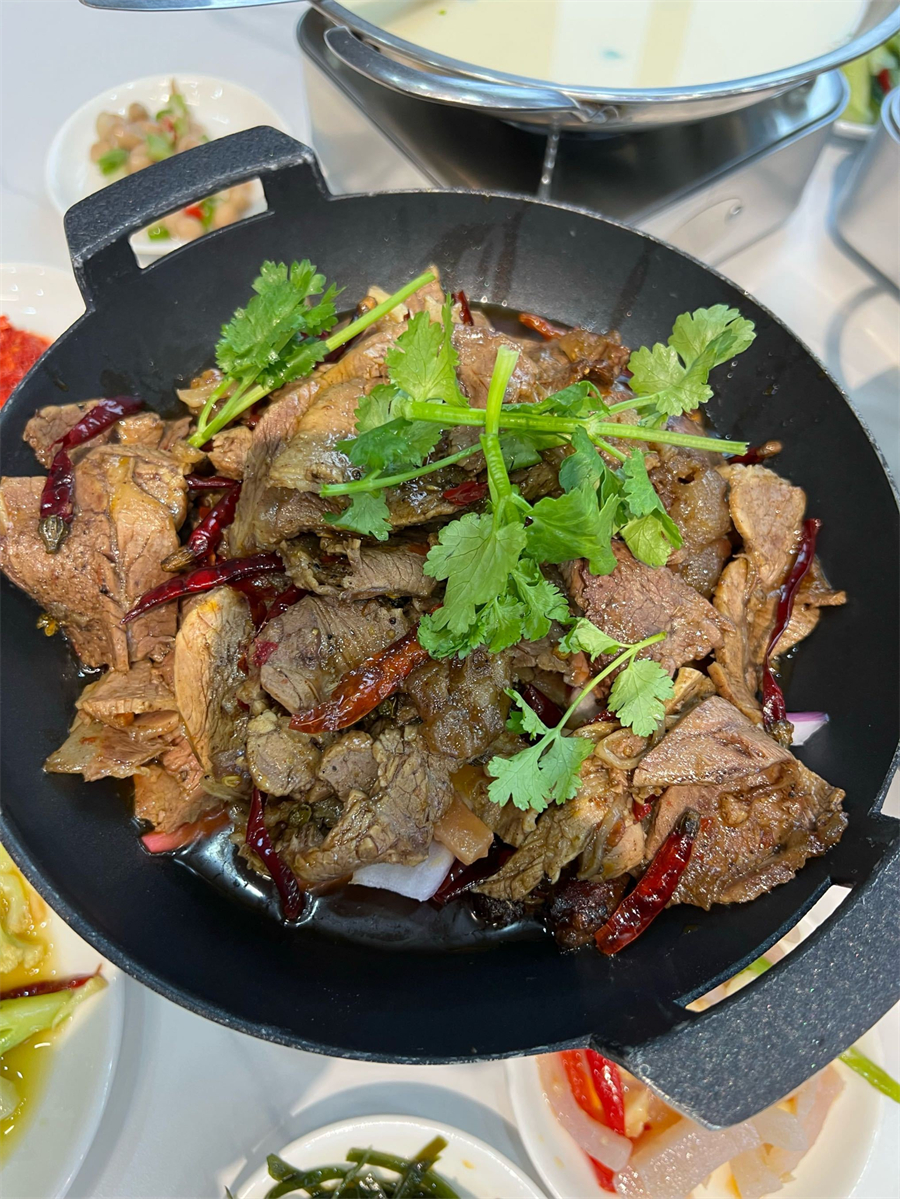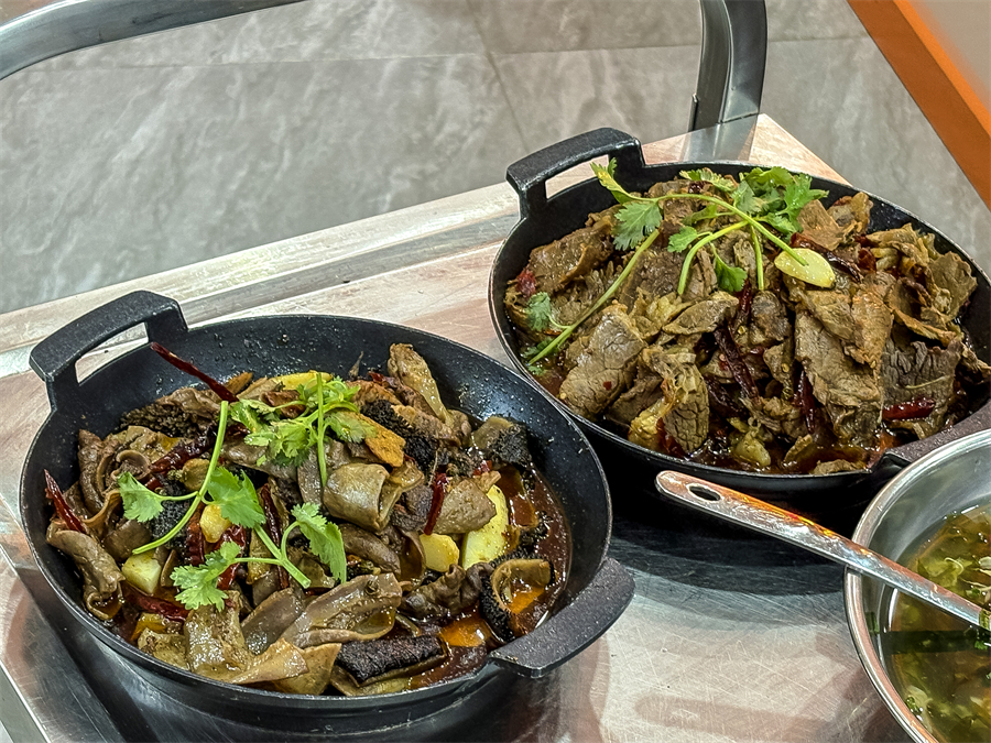 茶店牛肉是店里的招牌,几乎每桌必点。牛肉在干锅内冒着热气,香气弥漫。夹一块肉牛入口,肉质鲜嫩爽口,嚼劲十足,浓郁的牛肉香味瞬间在唇齿间散开,让人回味无穷。还搭配有牛骨萝卜汤、合渣汤、各种荤素小菜和凉菜,让人尽享舌尖盛宴。