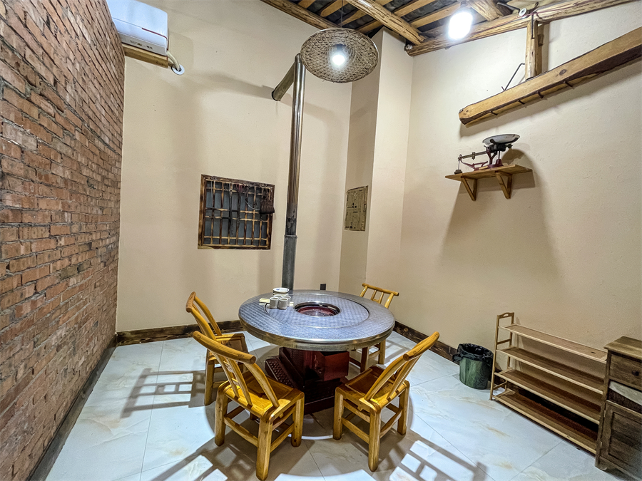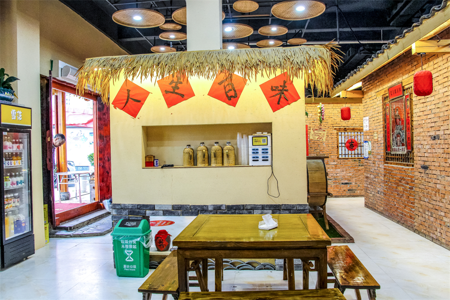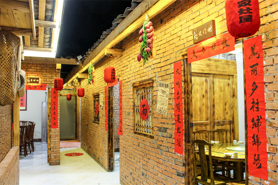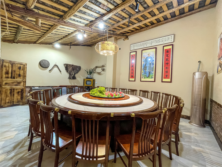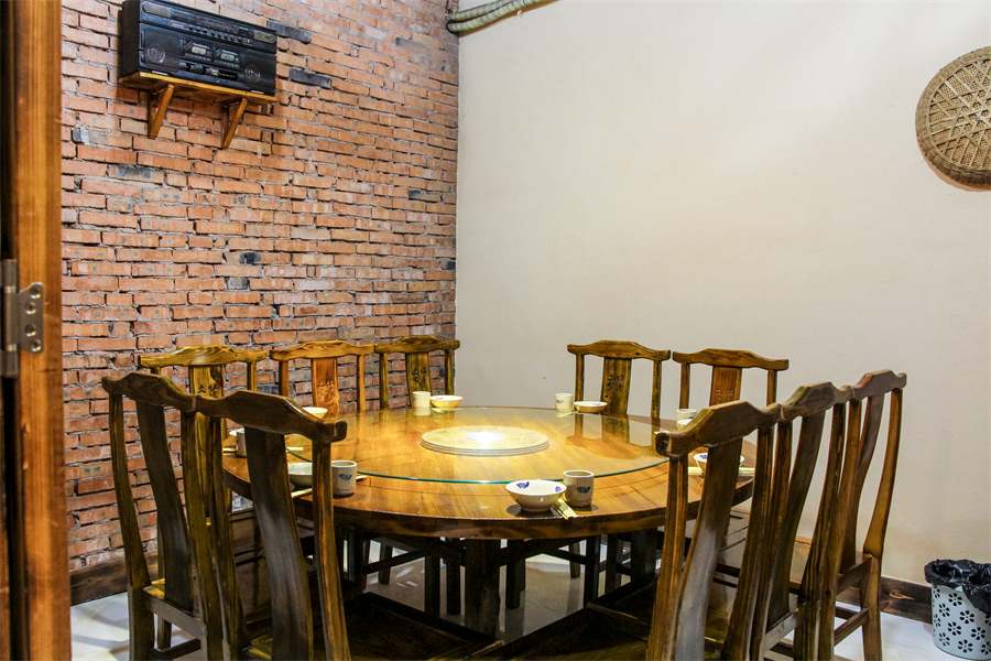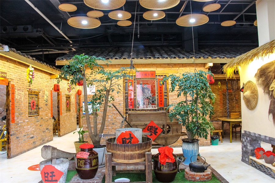 主打怀旧农耕主题,墙面贴着老照片与农耕工具复刻画,墙角陈列着蓑衣、斗笠、犁耙等小型农耕道具。桌椅设计简约实用,更适合家庭聚餐或朋友小聚,用餐时仿佛能回忆起往昔的农耕岁月,温馨又亲切。