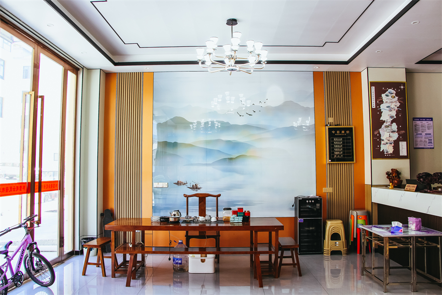 民宿一楼设有土特产展示区,茶叶、苞谷酒等恩施特产种类多样,可以挑选购买。还有茶台,可以沏上一壶热茶,与家人喝茶聊天,慢享时光。