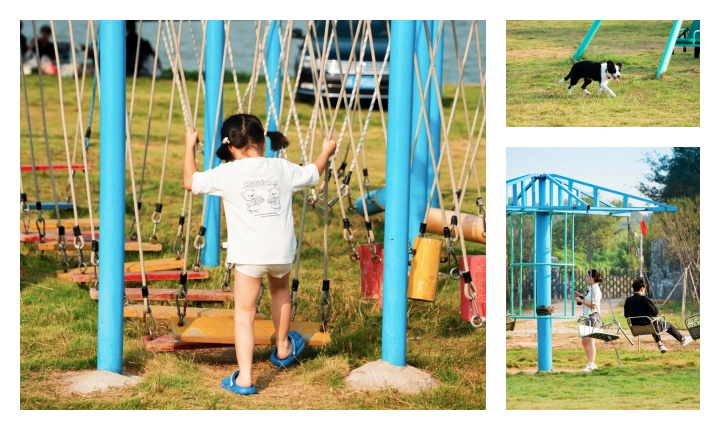 营地里的无动力乐园,随便玩!蹦蹦云、秋千、摇摇马......不仅适合小朋友放电,大人也可以在此找回久违的童心,被纯粹的快乐治愈。这里对毛孩子格外友好,小狗在草坪上追着风跑,在一线湖景里结识新友,拓展自己的“小狗朋友圈”。