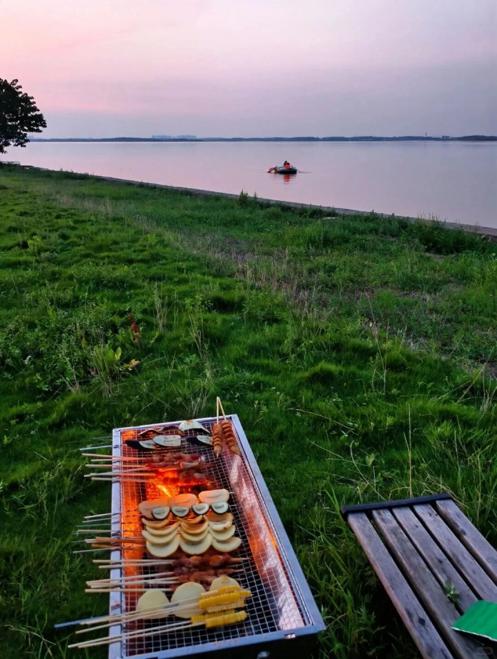 在湖边点一份营地的烧烤套餐。架起烤架,炭火噼啪,肉香裹着水汽钻进鼻子,勾得人直咽口水。