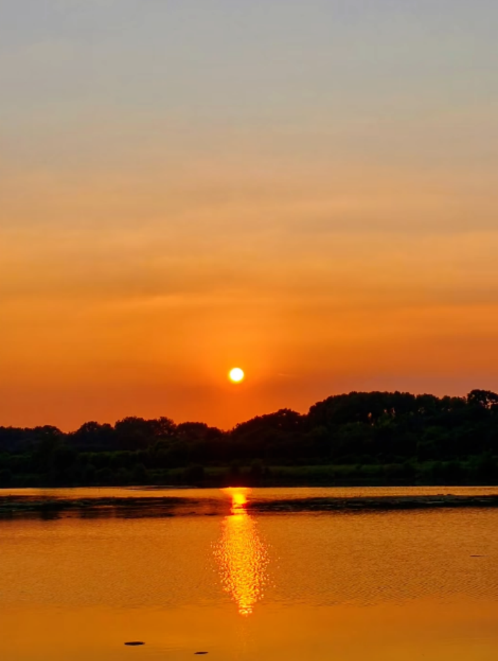清晨,太阳从湖面慢慢爬上来,把湖水染成金红色,波光粼粼像撒了一层碎钻。傍晚,天空被晕成橘黄,草地、湖面镀上一层暖光。原来浪漫不用刻意去寻找,就在这样的寻常傍晚里。