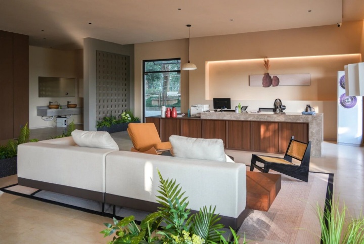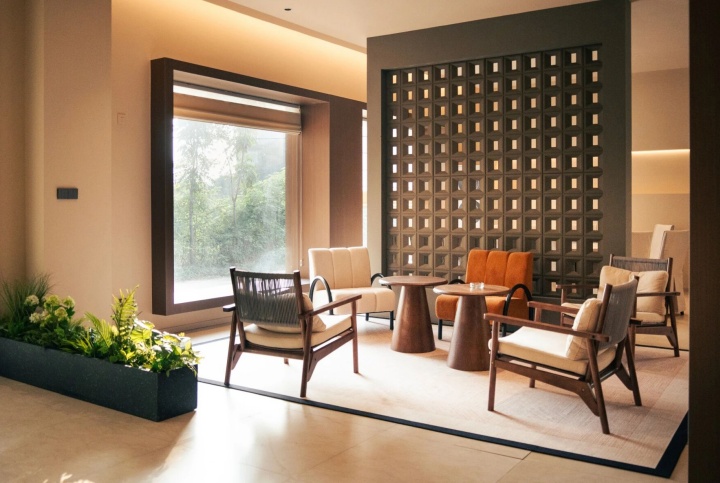 推门踏入公共区域,温暖的大地色系墙面为空间增添了几分柔和,木质纹理家具简洁沉静。巧妙嵌入的绿植,让自然生机悄然融入空间,营造出“身处室内,心向自然”的通透呼吸感。大堂的两处休憩区,均设有柔软的沙发与设计感座椅,搭配柔和灯光,让交流与独处都能在舒适氛围中缓缓发生。