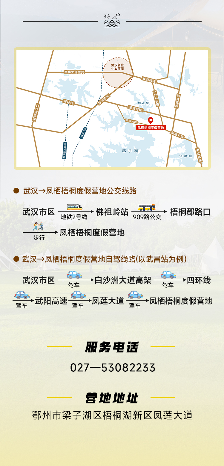凤栖梧桐度假营地(梧桐湖酒店)位于湖北省鄂州市梁子湖区梧桐湖新区凤莲大道,东临鄂州市鄂城区,南接湖北省第二大湖泊梁子湖,西靠武汉东湖高新区,北毗梧桐湖万亩湿地:地处武汉、鄂州、黄石、咸宁、黄冈五市中心,武鄂高速等交通干线环绕,交通优势显著。