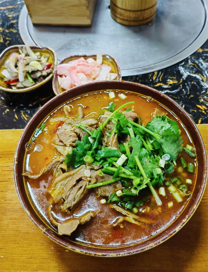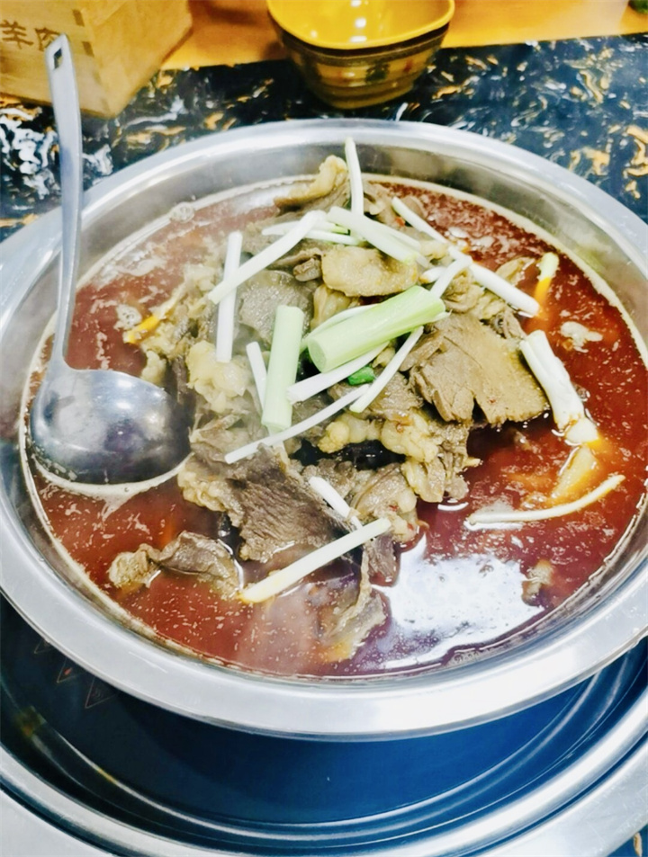 精选本地新鲜山羊,剔骨切片煮至成熟,再入秘制酱料烩煮,软烂无膻、鲜香入味。羊骨高汤是灵魂,香料慢熬至汤色清亮、滋味醇厚,每一口都浸着食材本味。劲道面条淋上红汤羊肉,撒上翠绿葱花香菜,配爽脆腌白菜或酸萝卜,软弹脆层次拉满,吃完连汤都不剩。