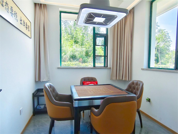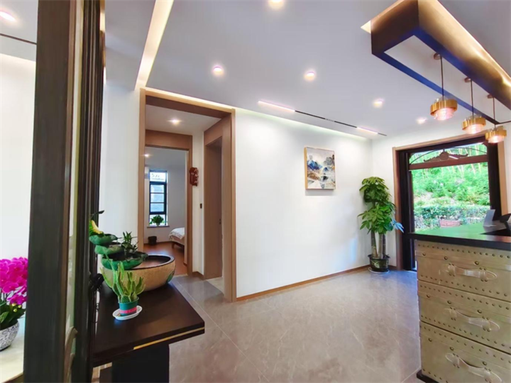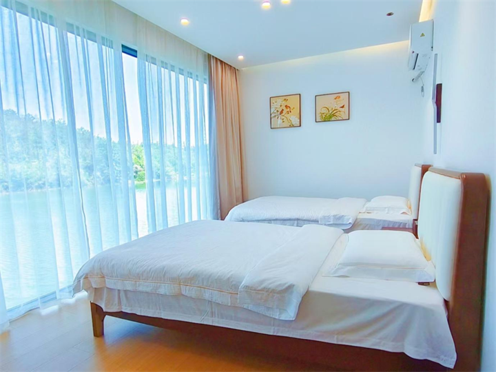 民宿以浅灰调为基底,原木色家具与简约线条相衬,糅合现代轻奢与东方留白。全景落地窗引湖光入室,半通透木格栅让空间回归通透本真,湖风与光线自由穿梭。