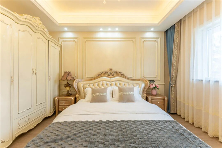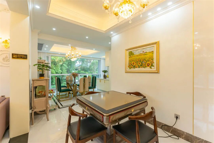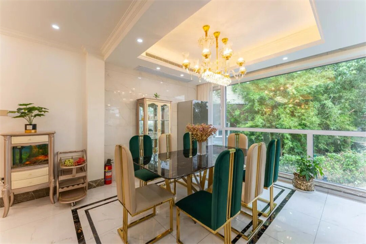 推开门,挑高客厅里的水晶吊灯暖光流转,法式雕花墙面搭配墨绿丝绒沙发与黑金家具,复古又高级。