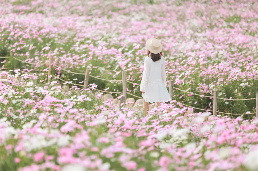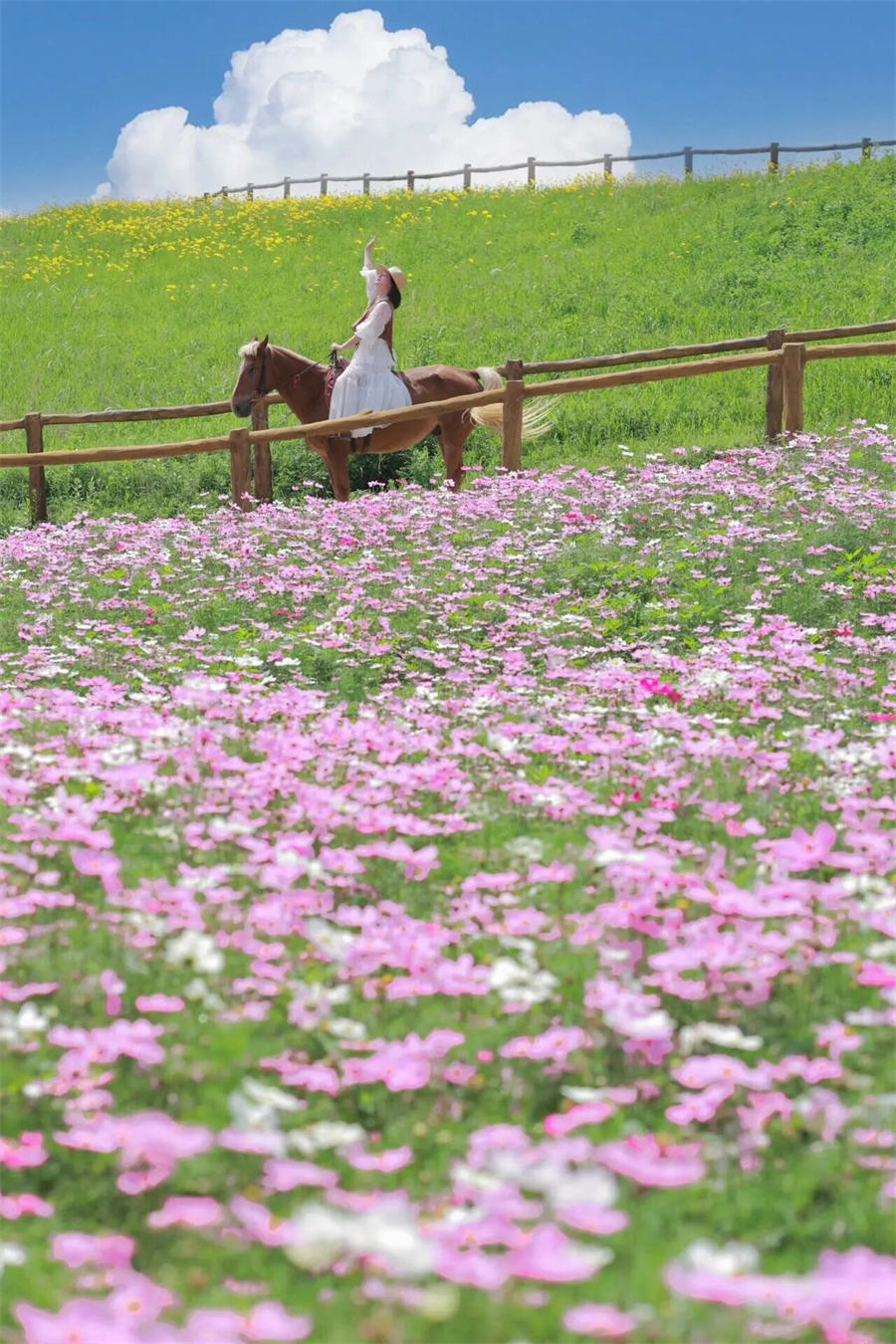 格桑花海:漫山遍野的格桑花在湖边、马场旁如期盛放,粉白相间的花海绵延起伏,与碧水蓝天交相辉映。无需远赴高原,在武汉周边就能邂逅这份错过等一年的浪漫。