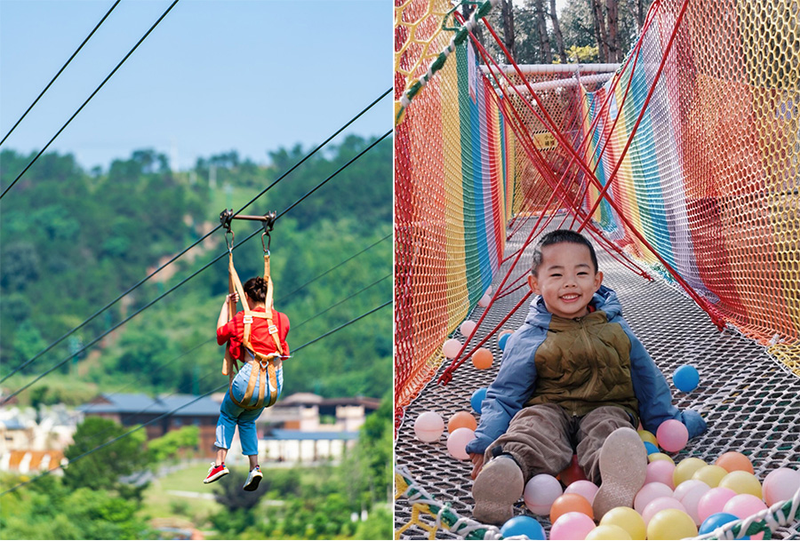 轻冒险体验:还有悬崖秋千、丛林魔网、水上自行车等30多种项目任君选择,充分释放多巴胺。