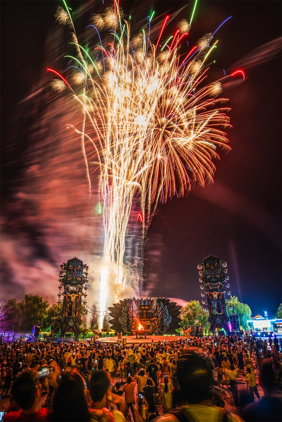 《山海烬长歌》(夜场):当夜幕降临,凤凰广场化身奇幻的山海经世界。以非遗打铁花、火壶、喷火等绝技,演绎上古神话。请务必清空手机内存,因为每一帧都美到让人疯狂拍照。演出结束后,直接加入星夜狂欢派对,在草原星空下来一场户外蹦迪,甩开所有烦恼。