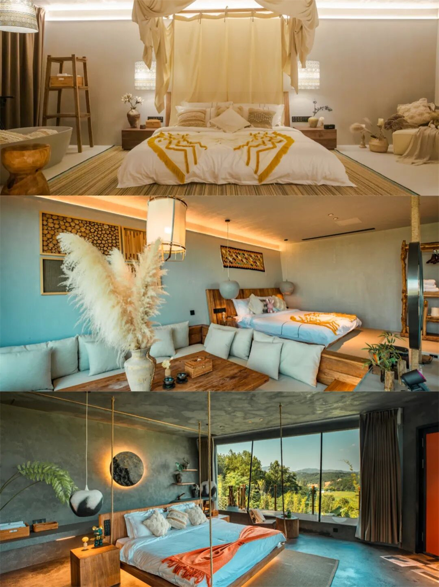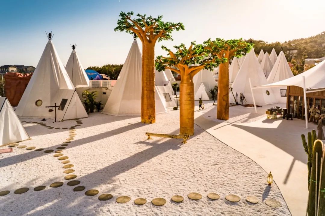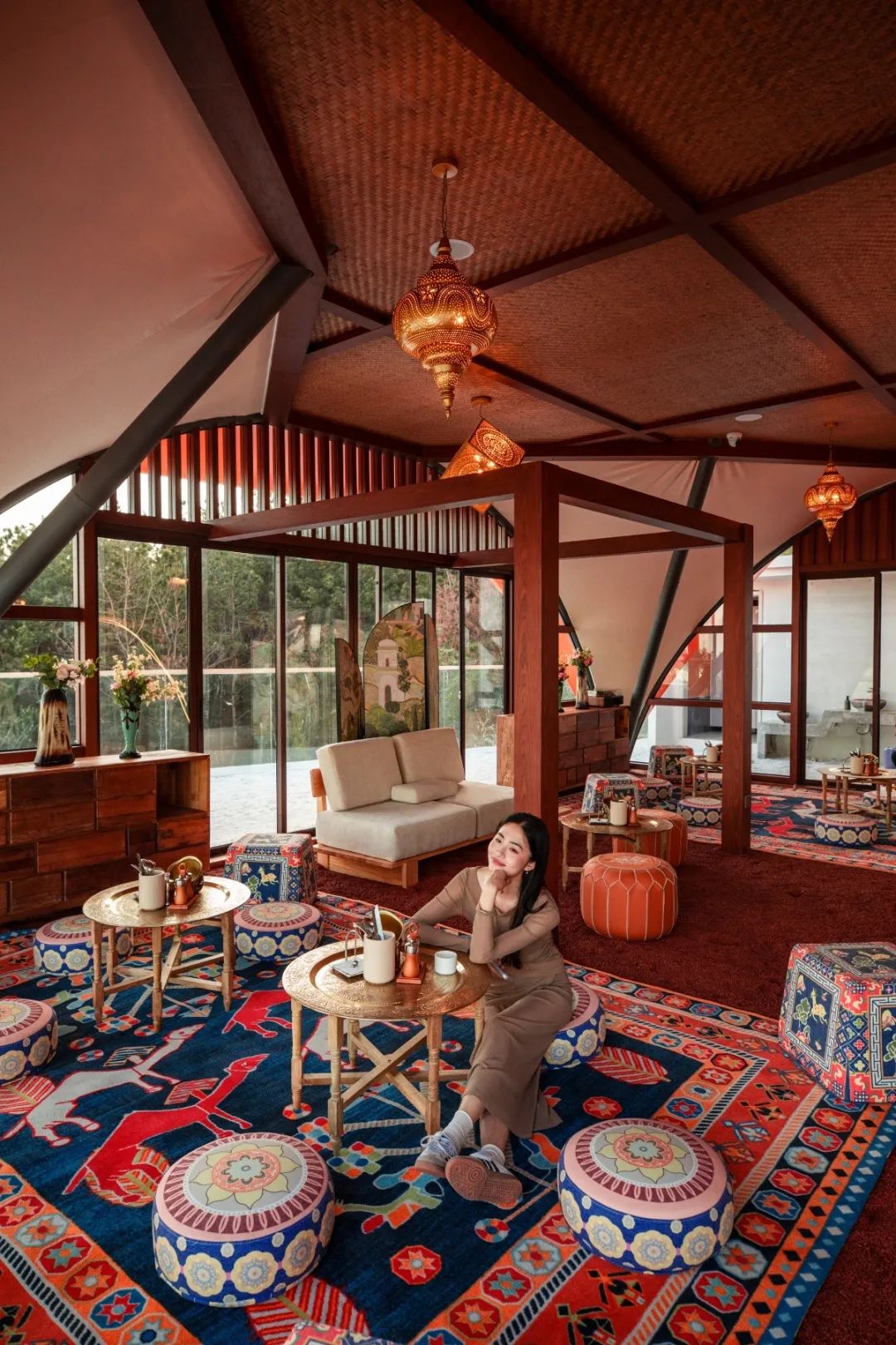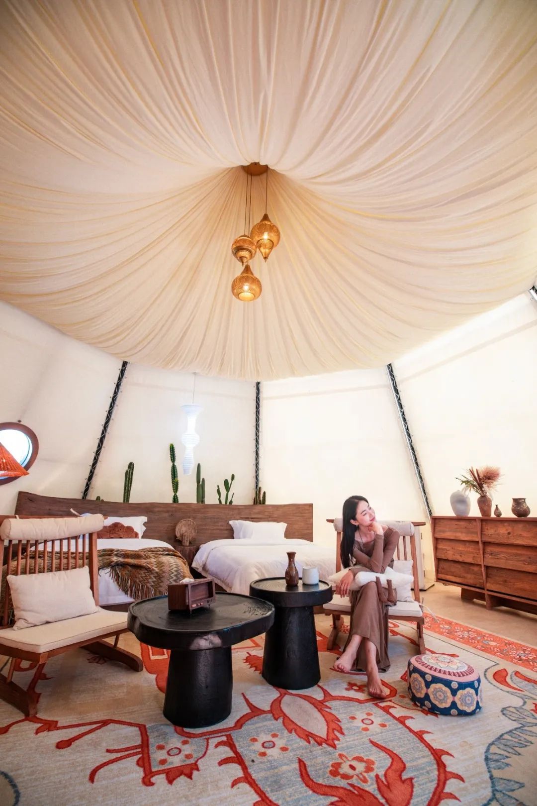 伊尔那非伽沙漠酒店:融入摩洛哥风情,在独立庭院的尖顶帐篷中,体验异域的浪漫与神秘。独栋别墅式的度假酒店隐于木兰草原景区内,占地面积15000平方米,周围环绕着雄伟壮观的砂岩石山和沙生植物,充满原始与自然的气息。度假酒店拥有尖顶风格的野奢Glamp帐篷,每一个帐篷内部空间有60㎡,拥有封闭式庭院、宽敞卧室和独立浴室。