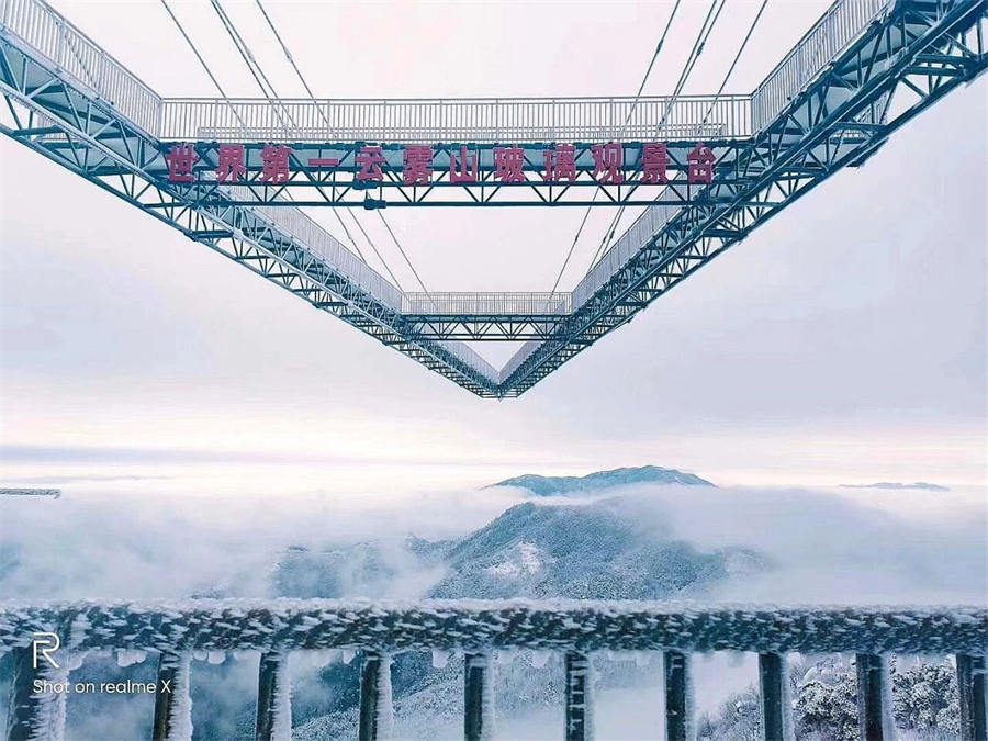 建立在云雾山主峰上的“武汉之巅云中悬廊”玻璃观景平台创吉尼斯世界纪录,悬挑出去的长度为81.9米,突破了世界上同类项目的世界纪录,是世界上最长的悬挑玻璃观景平台。海拔709米,其垂直高度达500米,相当于166层楼的高度,极具视觉冲击,堪称云端观景台。
