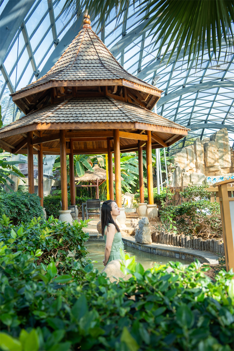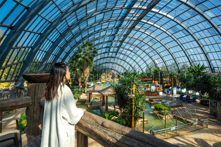 度假村最令人瞩目的标志,莫过于其全球最大的室内温泉馆——“水立方”。这座由北京奥运水立方原班人马匠心打造的建筑奇迹,以其无柱式全玻璃钢架结构,构建出跨度达108米的恢宏空间。蓝宝石般的穹顶之下,是一个面积达5000平方米的梦幻水世界。