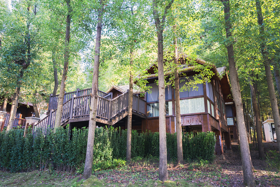 悦心・溪畔林居树屋:依托原生态的林缘水系而建,将温泉泡池巧妙嵌入阳台或露台。入住其中,仿佛栖息于森林之上,在智能舒适的氛围中体验“隐于自然”的轻奢野趣。