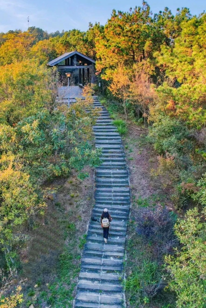 若想以从容的姿态开启秋日漫游,大花山直通山顶的“天梯”便是不错的选择。沿着笔青灰色的石阶,用脚步丈量秋意,十分钟左右即可轻松登顶,对老人与孩子都足够友好。 登顶后,漫步林间,秋日的温柔扑面而来。行至中途,停下脚步俯瞰江夏城市风光。若赶在傍晚来,还能撞见日落西山的盛景。