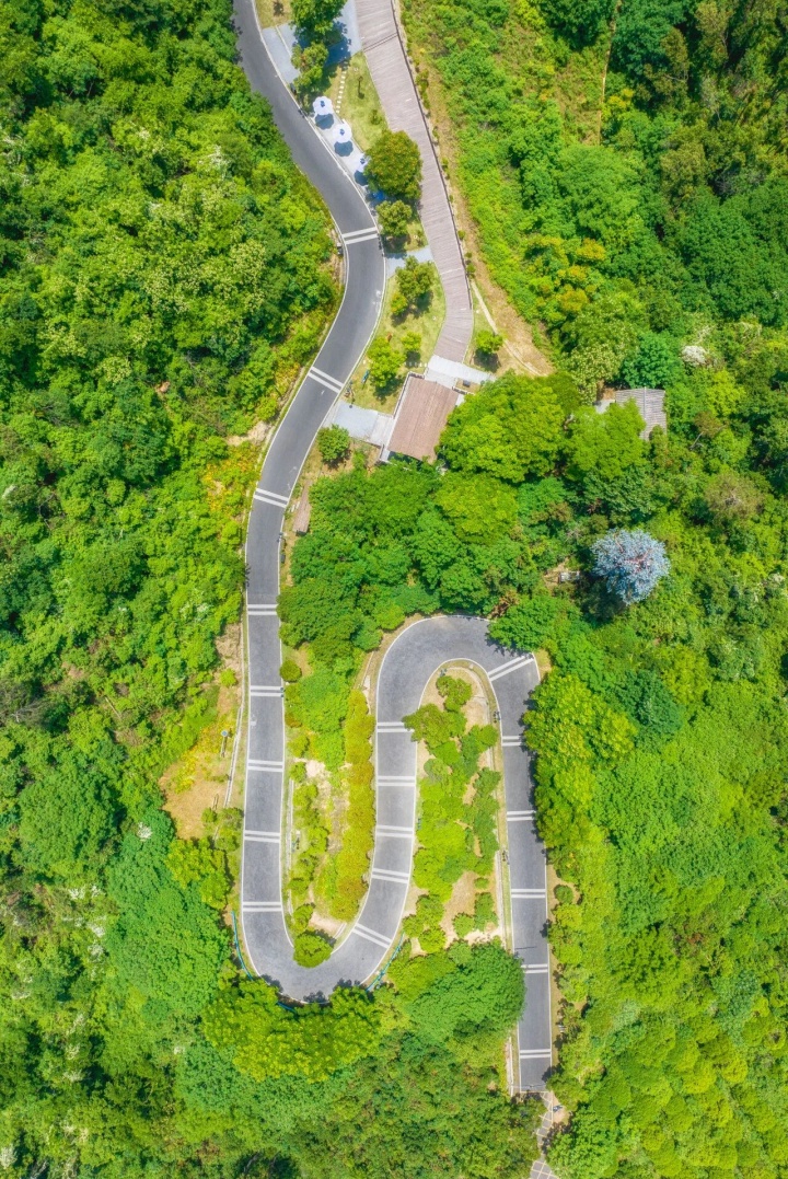 沿着环山绿道,抵达“小青岛”柱皮山,从山脚到山上观景台全程大约1.2km,半小时可登顶。红色屋顶、黄色围栏,再配上S弯道,怎么拍都出片。