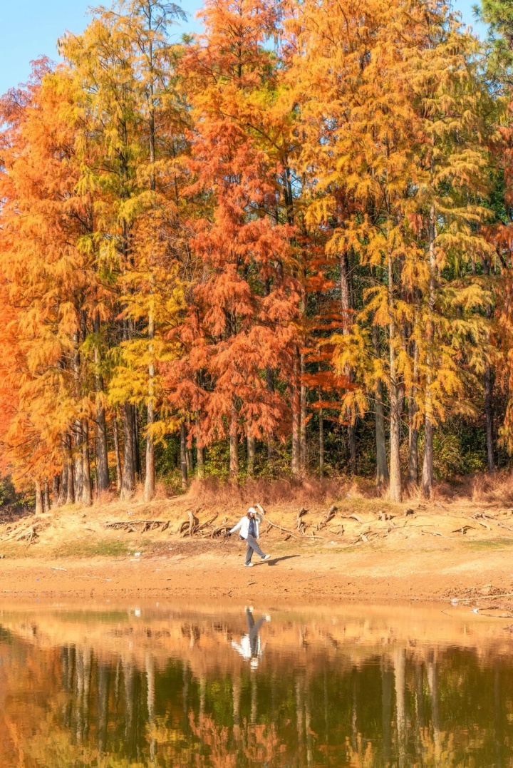 蓦然闯入青龙山的一方秘境,当水杉从翠绿渐渐蜕变为焦糖色,倒影在湖水中轻轻晃动,每一帧都像极了印象派的油画。(水杉林预计11月底-12初迎来最佳观赏期,目前还未完全变色)