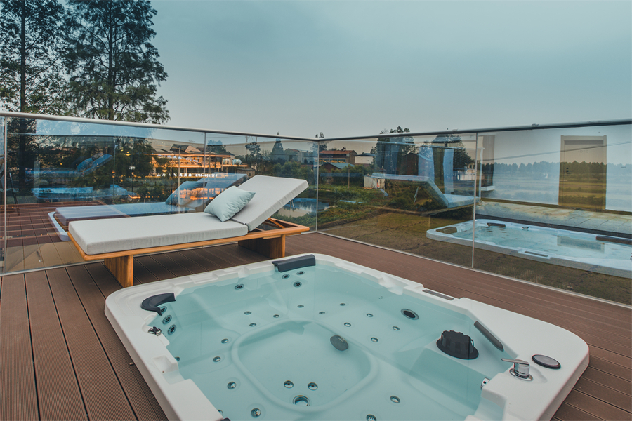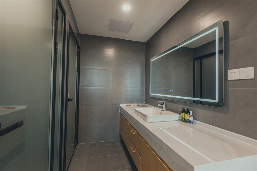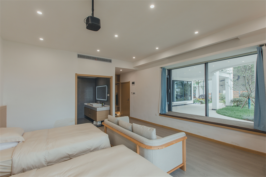 ②配套:独立卫生间、淋浴间 8人长桌一张,沙发区,独立卫生间,每个卧室(房间)均有投影、沙发、干湿分离卫生间、