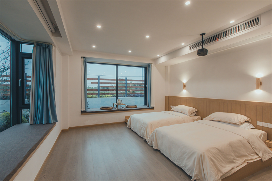 卧室1:106双床房(1.35*2m*2张),投影、飘窗榻2个 卧室2:107大床房(2m*2m),电视 卧室3:213星空大床房(2m*2m),电视